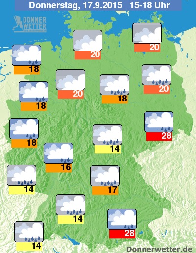 Heute Nachmittag zeigen sich nur noch selten Auflockerungen und es zieht überwiegend dichte Bewölkung durch, dabei fällt besonders von der Mitte bis in den Südwesten Deutschland häufig Regen und hier sind die Niederschläge zum Teil auch kräftig, langanhaltend und ergiebig. In den anderen Landesteilen fällt zeitweise Regen. Im Norden bleibt es jedoch überwiegend trocken. Die Temperatur steigt auf kühle 16 Grad am Pfälzer Wald und bis auf sommerliche 28 Grad an der Neiße. Im Norden weht teils starker bis stürmischer Wind mit möglichen Sturmböen, an Nord- und Ostsee herrscht zum Teil auch Sturm.