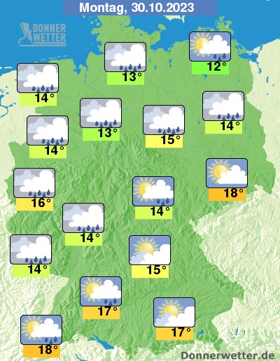 Am Montag bleibt es über der Nordwesthälfte weitgehend bedeckt und es fällt verbreitet Regen. Im Süden und Osten ist es teils stark, teilweise aber auch aufgelockert bewölkt, hier fällt nur selten etwas Regen. Die Temperatur steigt auf 12 Grad in Rostock und bis 18 Grad in Freiburg.