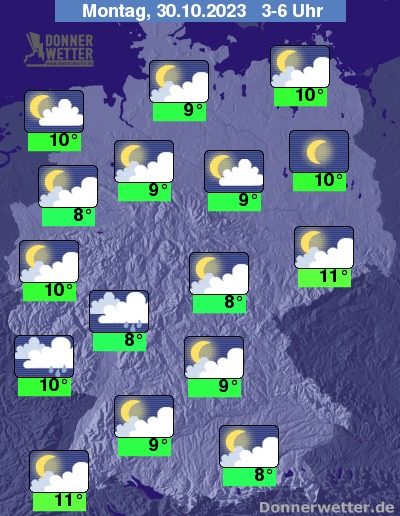 In der bevorstehenden Nacht zieht es sich im Westen Deutschlands immer weiter zu und es setzt im Verlauf Regen ein. Im großen Rest des Landes zeigt sich der Himmel verbreitet locker bis aufgelockert, teils auch stark bewölkt, dazu bleibt es weitgehend trocken. Die Temperatur sinkt auf 11 Grad in Freiburg und etwa 8 Gard in Erfurt. An den Küsten weht ein oft stürmischer Wind.