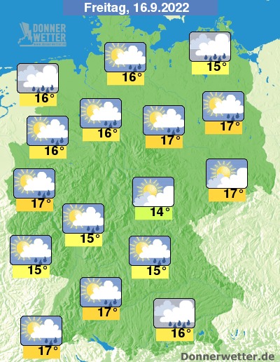 Am Freitag ziehen im Norden meist dichte Wolken durch, dabei bilden sich verbreitet Schauer, lokal auch Gewitter. Im übrigen Land ist es wechselnd oder stark bewölkt, dabei sind einzelne Schauer möglich. Die Temperatur steigt auf 14 Grad im Grabfeld und bis 17 Grad im Breisgau. An den Küsten weht ein zum Teil stürmischer Wind.