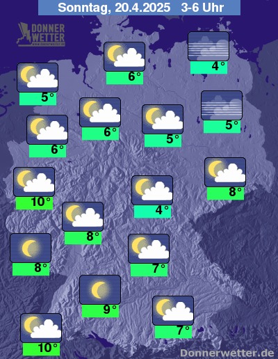 In der Nacht zum Ostersonntag zeigt sich der Himmel über dem Land verbreitet nur locker bewölkt und vielerorts auch sternenklar, dazu bleibt es trocken. Die Temperatur sinkt auf 10 Grad am Rhein und bis etwa 4 Grad an der Müritz.