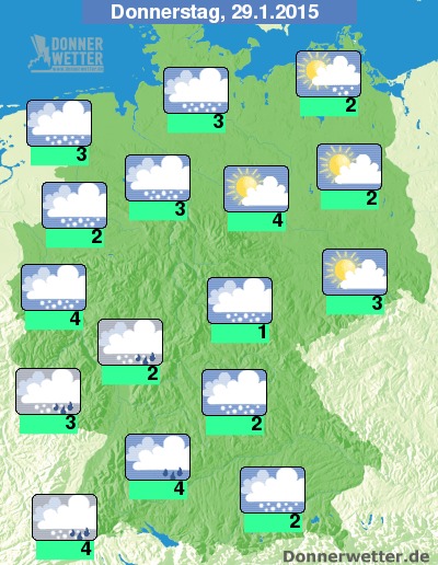 Heute ziehen von Westen her kommend dichte Wolken mit teils kräftigen Schneefällen übers Land, vor allem in den westlichen Landesteilen fällt dabei auch häufig Regen oder Schneeregen. Im Osten und Nordosten ist es vormittags noch weitgehend trocken und teils freundlich, spätestens am Nachmittag ziehen aber auch hier dichte Wolken mit Schneefällen auf. Es besteht verbreitet Glättegefahr auf den Straßen. Die Höchstwerte erreichen 1 Grad im Grabfeld und bis 4 Grad am Oberrhein. Der Wind weht noch oft frisch, teils auch stark mit vereinzelt stürmischen Böen, an Nord- und Ostsee sind einzelne Sturmböen möglich.