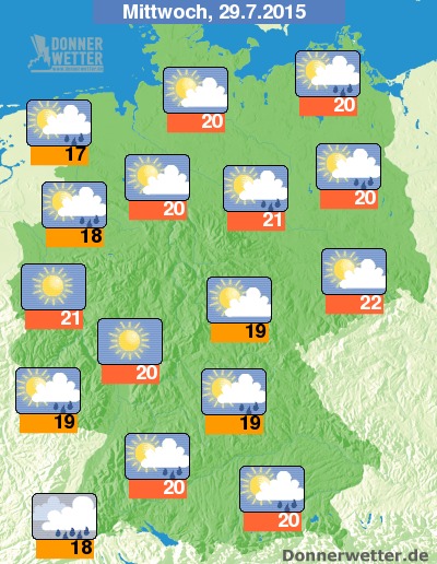 Am Mittwoch ist es im Norden wechselnd oder stark bewölkt und es bilden sich verbreitet Schauer und auch mögliche Gewitter. Im Süden Deutschlands ist es oft stark oder auch dicht bewölkt und es fällt gebietsweise Regen. Im großen Rest des Landes ist es hingegen heiter bis sonnig und dazu trocken. Die Temperatur steigt auf 17 Grad an der Nordsee und bis 22 Grad in Leipzig.