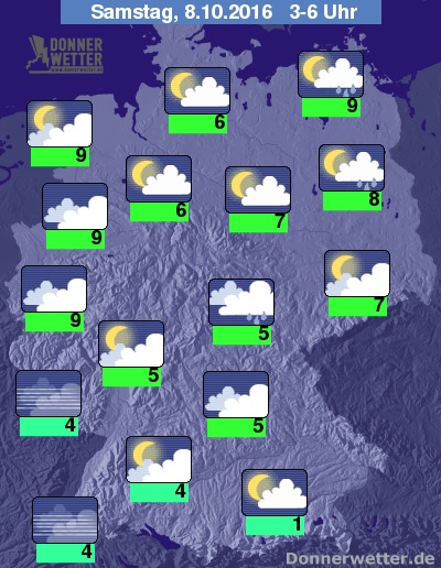 In der folgenden Nacht ist es teils stark, teils aufgelockert bewölkt, im Ostseeumfeld fällt zeitweise Regen, sonst bleibt es weitgehend trocken. Stellenweise kann sich Nebel oder Hochnebel bilden. Die Temperatur sinkt auf 9 bis 3 Grad.