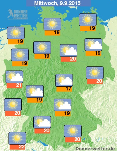 Am Mittwoch scheint im Land verbreitet die Sonne und es ziehen größtenteils nur mal lockere Wolken durch, häufig ist es sogar sonnig. Gebietsweise dichtere Wolken sind im Tagesverlauf jedoch in Berlin-Brandenburg sowie im äußeren Südosten des Landes möglich, sie bringen jedoch kaum Niederschläge, im übrigen Land bleibt es ohnehin trocken. Die Temperatur steigt auf 17 Grad im Coburger Land und bis 22 Grad im Breisgau.