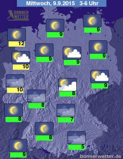 In der folgenden Nacht ist es im Norden und Süden der Republik weitgehend sternenklar und nur hier und da ziehen lockere Wolkenfelder durch, dazu bleibt es trocken. Von der Landesmitte bis in den Osten Deutschlands hält sich dagegen auch teils starke, sonst aber auch oft aufgelockerte Bewölkung, dabei bleibt es weitgehend trocken. Die Temperatur sinkt auf 12 Grad an der Nordseeküste und bis 5 Grad im Raum München. Stellenweise bildet sich Nebel oder Dunst.