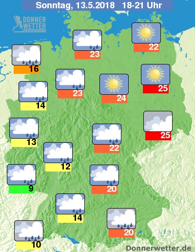 Heute Abend ist es im Osten und Nordosten weiterhin heiter bis sonnig und trocken. Im übrigen Bundesgebiet bleibt die Wolkendecke hingegen meist verschlossenund es fällt auch wiederholt Regen, der zum Teil auch kräftig und gewittrig ausfällt. Die Temperatur liegt bei 9 Grad am Pfälzer Wald und um 25 Grad in Berlin.