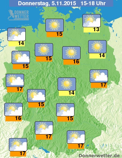 Am Nachmittag ist es in weiten Teilen des Landes wechselnd oder stark bewölkt, heitere Abschnitte finden sich vor allem entlang der Weser sowie am Niederrhein. Die Temperaturen liegen dann bei Werten um 12 Grad C an der Ostseeküste und um 17 Grad C in Dresden.