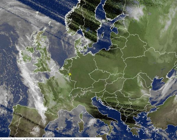 Auf dem Satellitenfoto von heute Morgen zeigen sich Mittel-, Ost- und Südosteuropa verbreitet nur gering bewölkt oder wolkenlos. Dagegen bringen die Ausläufer eines Tiefs über dem Atlantik viele dichte Wolken und zahlreiche Schauer von den Britischen Inseln, über Frankreich bis auf die Iberische Halbinsel.