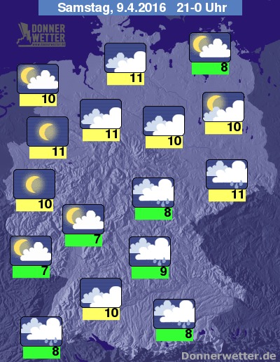 Heute Abend ist es über dem Süden und Osten Deutschlands verbreitet stark bewölkt, dabei breitet sich das Regengebiet über dem Südosten der Republik auch auf Sachsen und Thüringen hin aus, sonst bleibt es über der Südosthälfte weitgehend trocken. Im äußeren Westen und Nordwesten ist es oft sternenklar und dabei trocken, sonst zieht teils aufgelockerte, teils starke Bewölkung durch, dabei bleibt es ebenso trocken. Die Abendtemperatur liegt bei 11 Grad in Hannover und um 7 Grad im Saargau.