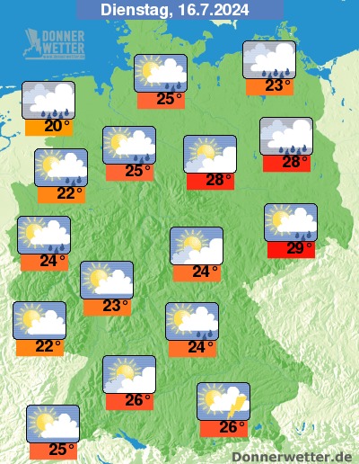 Am Dienstag können sich vor allem über der Nordhälfte des Landes sowie im Süden gebietsweise Schauer und lokal auch Gewitter bilden. Im übrigen Land scheint auch häufig die Sonne und es bleibt meist trocken. Die Temperatur steigt auf 22 Grad in Saarbrücken und bis 29 Grad in Dresden.