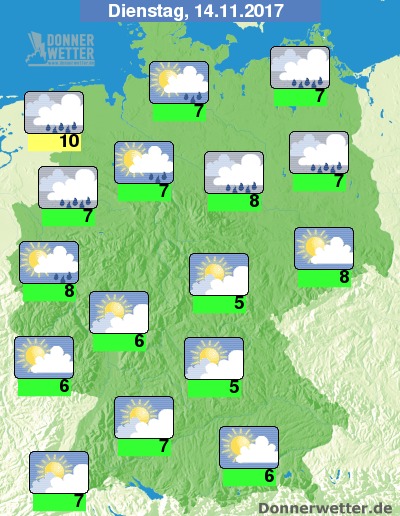 Am Dienstag zieht von Nordwesten her dichte Bewölkung und zeitweiliger Regen auf, der bis zum Abend etwa bis einschließlich zu einem breiten Streifen von NRW bis nach Berlin-Brandenburg zieht. Südlich davon ist es zumeist locker bis aufgelockert bewölkt und dabei trocken. Die Temperatur steigt auf 5 bis 10 Grad.