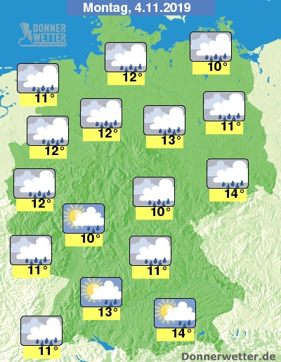 Der Wochenstart wird verbreitet trüb und nass, denn die Sonne kann sich nur hier und da mal zeigen, sonst dominieren Wolken das Wettergeschehen und es fällt zeitweise Regen. Die Temperatur steigt auf milde 10 bis 14 Grad.