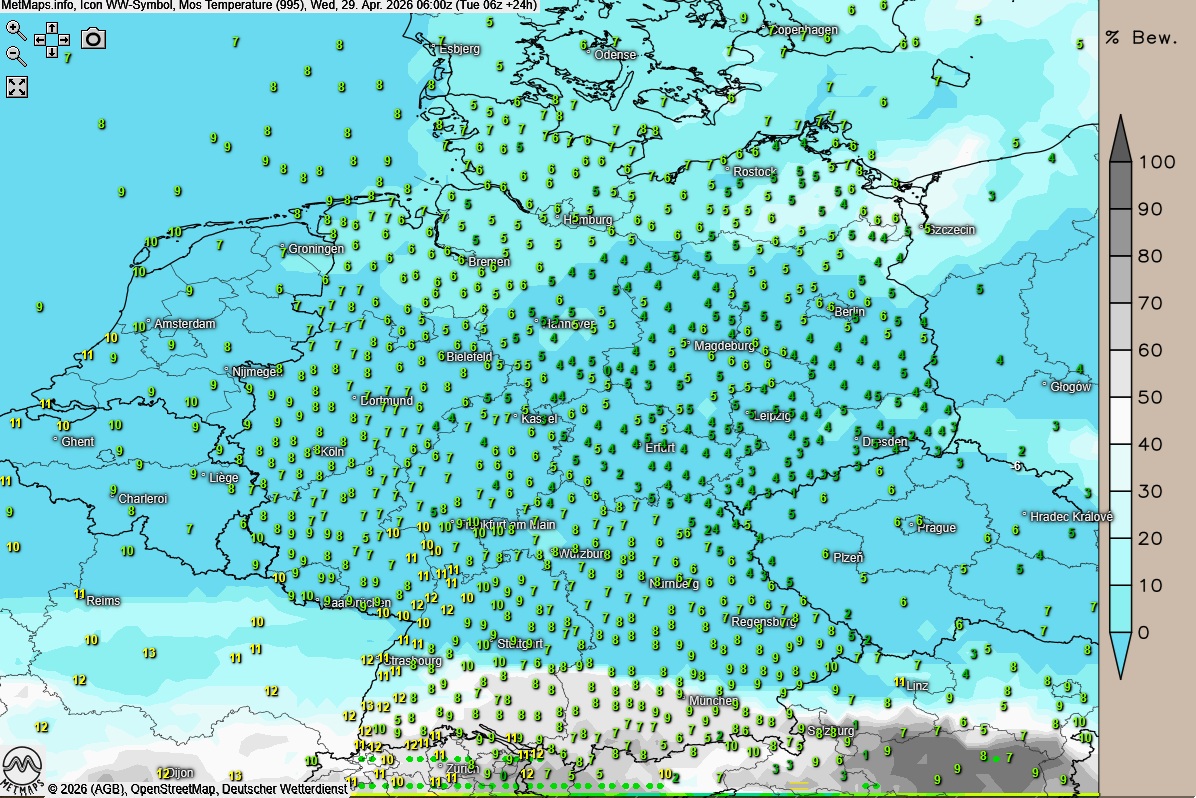 Die Wetterkarte für Mittwochfrüh (06:00 Uhr) sowie die Temperaturkarte für 12:00 Uhr nach ICON: