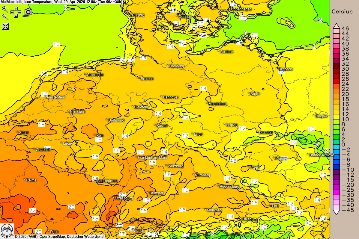 Die Temperaturen zeigen dabei weiterhin ein deutliches Gefälle: Im Westen klettern die Werte auf milde 18 bis 21 Grad, am Oberrhein sind sogar Spitzenwerte bis knapp 23 Grad drin. Der Norden und Osten bleiben mit 11 bis 18 Grad etwas kühler.
