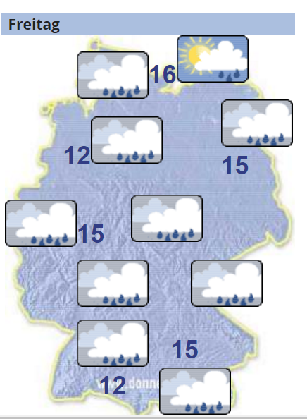 Am Samstag wird es dann noch etwas wämer und sonniger, aber schon am Sonntag droher wieder Schauer..... Immerhin sind über 20 Grad C am Wochenende möglich.