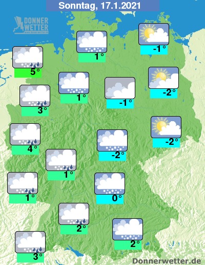 Am Sonntag ist es im Osten und Nordosten zwar meist stark bewölkt, jedoch trocken. Ansonsten ziehen von Westen her dichte Wolken durch und es fällt zeitweise Schnee, in den westlichsten Landesteilen auch Schneeregen oder Regen. Die Temperatur steigt auf -2 Grad in Dresden und bis 5 Grad in Emden.