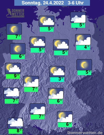 In der folgenden Nacht setzt im Südwesten und im Verlauf auch im Süden Regen ein. Im Küstenumfeld ist es ebenfalls meist stark, teils auch locker bewölkt, jedoch meist trocken. Im übrigen Land ist es größtenteils locker bewölkt bis sternenklar und dazu trocken. Die Temperatur sinkt auf 9 Grad in Bonn und 3 Grad in Jena.