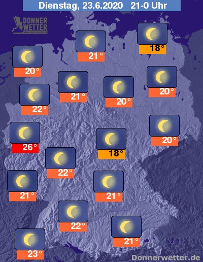 Die Temperaturen liegen Beginn des Abends noch zwischen 20 Grad an den Küsten von Nord- und Ostsee und heißen 30 Grad in den Ballungsgebieten des Westens.