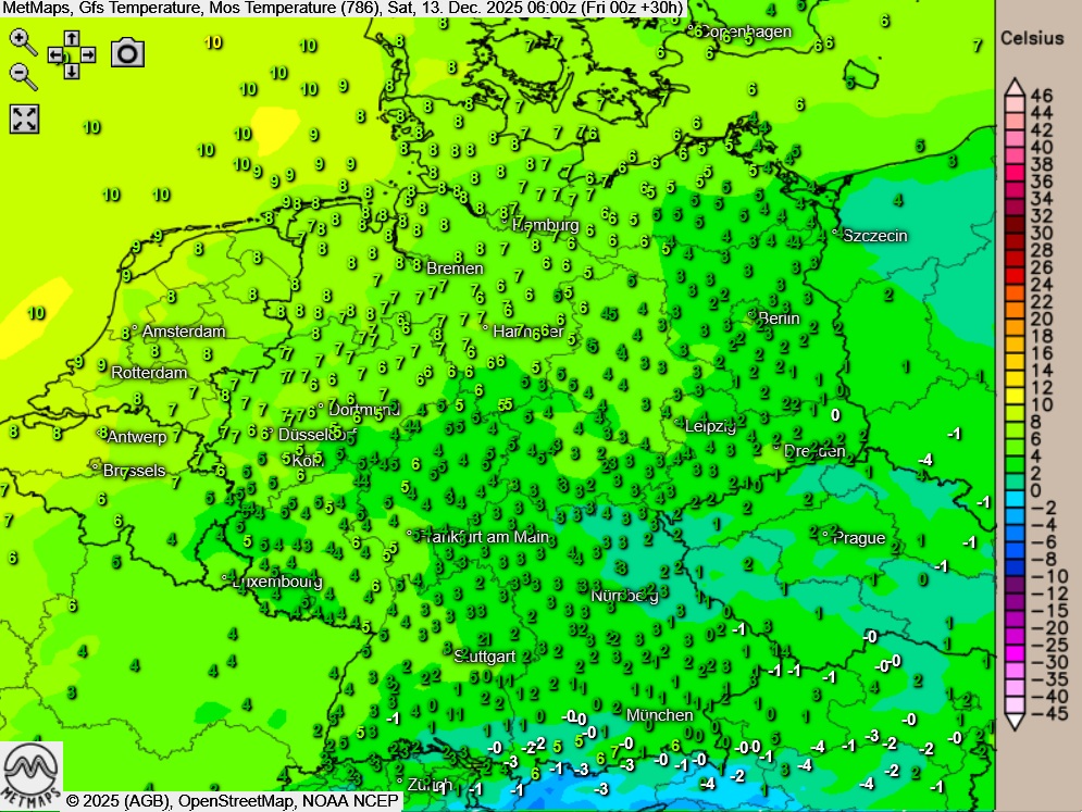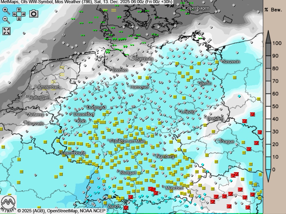 Die Temperatur- und Wetterkarte für Samstagfrüh (06:00 Uhr) nach GFS: