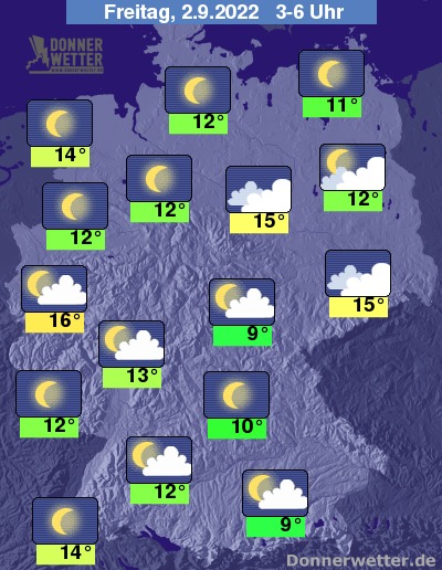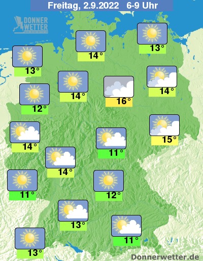 Die Temperaturen erreichen in den Frühstunden Werte um 11 Grad am Alpenrand, 14 Grad an der Spree und teils 16 Grad an der Elbe.