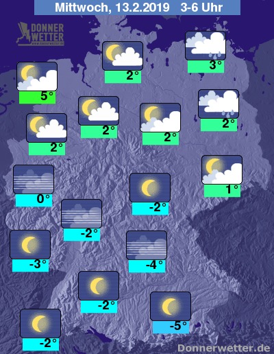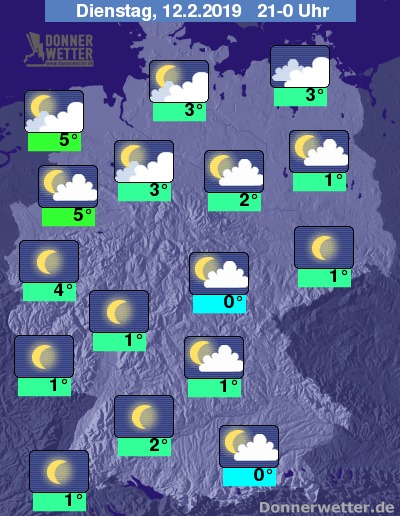 Während der zweiten Nachthälfte bilden sich in den mittleren und südlichen Landesteilen regionale Nebelfelder. Über den Nordosten ziehen dichtere Wolken mit etwas Regen oder Sprühregen hinweg. Sonst zeigen sich Mond und Sterne.