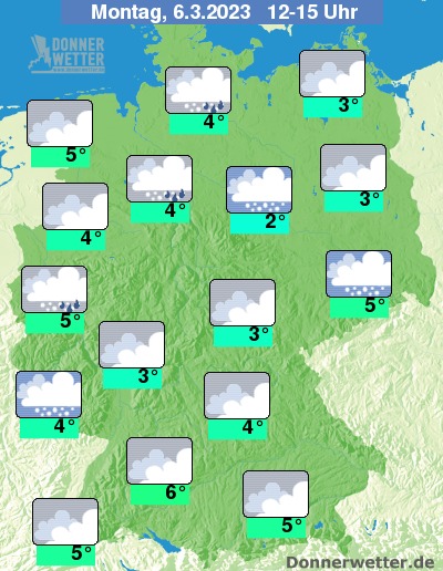 Heute Nachmittag bleibt der Himmel dicht bewölkt, dabei können sich gebietsweise Schneeschauer, zum Teil auch Schneeregenschauer bilden. Oft bleibt es aber auch trocken bei 2 Grad in der Magdeburger Börde und 6 Grad im Raum Stuttgart.