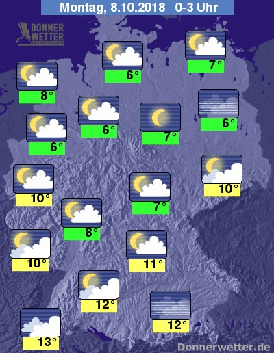 Die Temperaturen sinken im Nachtverlauf auf Werte um 13 Grad C im Breisgau und um 6 Grad C im Münsterland.