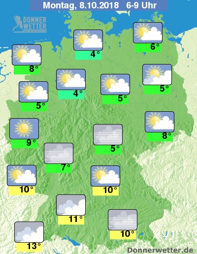 Der Montag startet in der Nordhälfte zumeist mit einem trockenen Mix aus Sonne und Wolken; im Süden bleibt der Himmel vielerorts bedeckt, regional kann sich auch Nebel bilden.