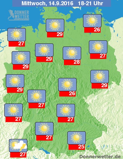 Heute Abend zeigt sich die Sonne immer noch von einem verbreitet wolkenfreien Himmel, nur hier und da ziehen auch mal lockere, jedoch harmlose Wolken durch. Im äußeren Südwesten besteht ein geringes Gewitterrisiko, sonst bleibt es aber trocken bei anfänglichen Höchstwerten von 25 Grad in München und um 29 Grad in Dortmund.