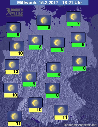 Ein sternenklarer Abend steht uns bevor. Keine einzige Wolken am Himmel. Dazu um 6 Grad C im Thüringer Land und bis zu 13 Grad C im Rhein-Sieg-Kreis. Im Westen und Süden insgesamt mildere Temperaturen als im Rest des Landes.