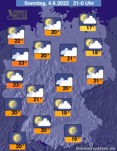 Die Temperaturen gehen bis Mitternacht auf Werte um 23 Grad am Niederrhein und 17 Grad an der Ostseeküste zurück.