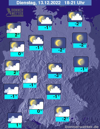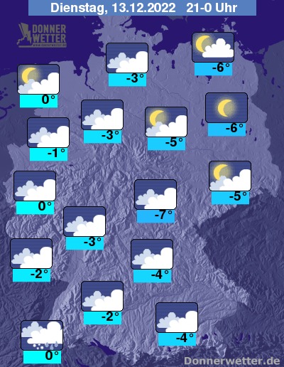 Es bleibt verbreitet trocken, am Abend ziehen von Südwesten her dann Schneefälle auf. Die Temperaturen gehen bis Mitternacht auf Werte um 0 Grad am Oberrhein und -7 Grad im Thüringer Becken zurück.