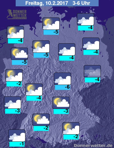 Dazu liegen die Höchstwerte aktuell bei frostigen -4 Grad in Teilen Thüringens und vergleichsweise milden +4 Grad am Niederrhein.