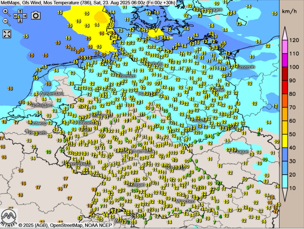 Die Temperatur- und Böenkarte für Samstagfrüh (06:00 Uhr) nach GFS.