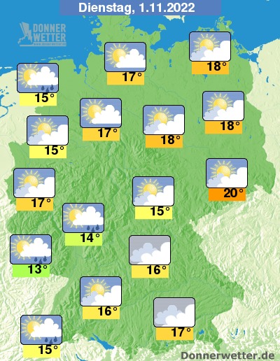 Am Dienstag zieht oft starke Bewölkung durch oder es ist trüb, jedoch bilden sich nur selten einzelne Schauer. Am Nachmittag scheint nach Westen hin verbreitet die Sonne, dabei bleibt es trocken. Die Temperatur erreicht nur 13 Grad im Saargau und bis 20 Grad in der Lausitz. Im Nordwesten ist es teils stürmisch, an der Nordsee herrscht auch Sturm.