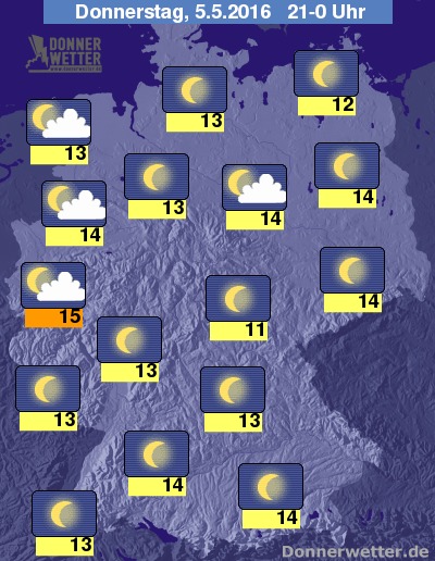 Heute Abend sind im Westen und Nordwesten, zum Teil auch nordöstlich des Harzes einige lockere Wolken unterwegs, im großen Rest von Deutschland bleibt es hingegen weitestgehend sternenklar, zudem bleibt es bundesweit trocken. Die Abendtemperatur liegt bei 15 Grad in Düsseldorf und etwa 11 Grad im Eichsfeld.