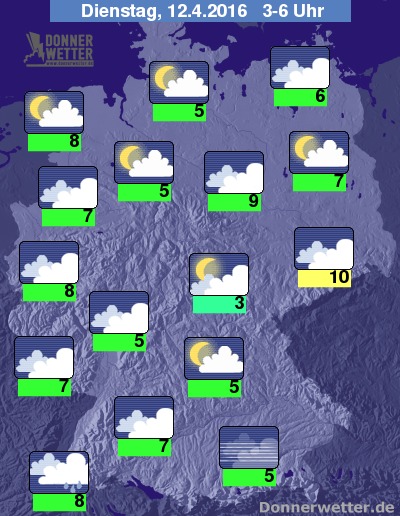 In der Nacht zum Dienstag ist es über dem Süden und Westen zunächst teils stark, teils aufgelockert bewölkt und weitgehend trocken, gegen Morgen nimmt die Bewölkung hier allgemein zu und es fällt gebietsweise Regen. Weiter nach Nordosten hin ist es aufgelockert bis stark bewölkt und zumeist trocken. Die Temperatur sinkt auf 10 Grad in Dresden und 3 Grad im Thüringer Becken.
