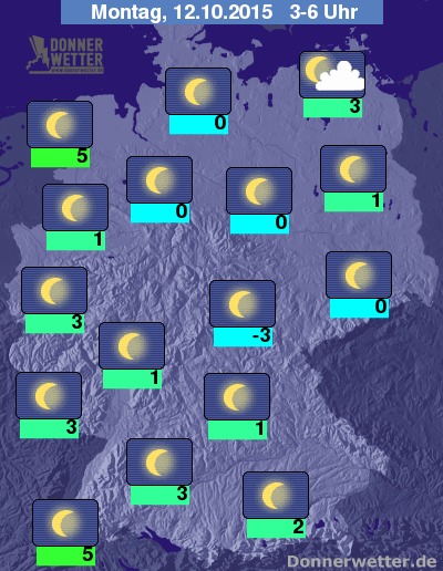 In der folgenden Nacht sind im Ostseeumfeld teils einige Wolken möglich, im großen Rest der Republik zeigt sich jedoch ein sternenklarer Himmel und es bleibt trocken. Die Temperatur sinkt auf 5 Grad in Emden und bis auf frostige -3 Grad im Thüringer Becken.