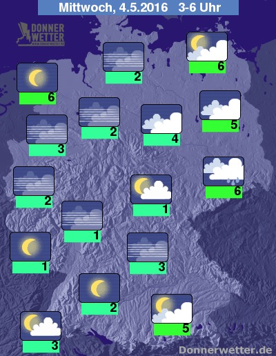 In der Nacht zum Mittwoch halten sich über dem Südosten und dem äußeren Osten des Landes noch überwiegend dichte Wolken, die auch zeitweise Regen bringen können. Über dem übrigen Osten und Nordosten ist es teils stark, teils aufgelockert bewölkt, jedoch trocken. Weiter nach Westen hin zeigt sich der Himmel weitestgehend sternenklar, hier und da sind ein paar Wolken möglich, dabei bleibt es trocken. Die Temperatur sinkt auf 6 Grad an der Oder und auf etwa 1 Grad am Taunus.