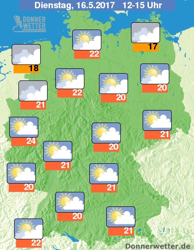 Am Mittag ist der Himmel in weiten Teilen des Landes nur leicht bewölkt und es wird sehr freundlich und sonnig. In Norden können hingegen vermehrt Wolken über den Himmel ziehen, aber es bleibt auch hier recht freundlich und trocken.