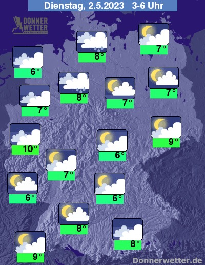 In der Nacht zum Dienstag klingen die Schauer in den westlichen Landesteilen und im Alpenvorland meist rasch ab, jedoch sind einzelne Schauer sowohl hier als auch im übrigen Land vereinzelt möglich. Im übrigen Land bleibt es bei teils aufgelockerter, teils starker Bewölkung weitgehend trocken. Die Temperatur sinkt auf 10 Grad in Bonn und bis 6 Grad in Jena.