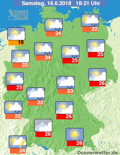 Am Sonntag bilden sich im Süden und Osten Deutschlands zeitweise Schauer und einzelne Gewitter, sonst ist es teils aufgelockert, teils stark bewölkt bei jedoch nur vereinzelten Schauern. Die Temperatur steigt auf 18 Grad im nördlichen Emsland und bis 26 Grad im Raum München.