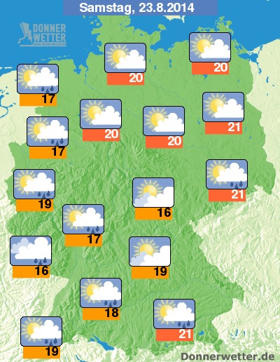 Am Samstag ist es vor allem zu Beginn häufig freundlich und verbreitet auch trocken, nach Westen hin und am Alpenrand sind einzelne Schauer möglich, sonst ist es zunächst meist locker oder aufgelockert bewölkt. Zum Nachmittag hin ziehen von Westen her teils dichte Wolken auf und es können sich vielerorts Schauer und auch Gewitter entwickeln. Meist trocken bleibt es im Nordosten des Landes. Die Temperatur steigt auf 16 Grad am Thüringer Wald und 21 Grad in Berlin.