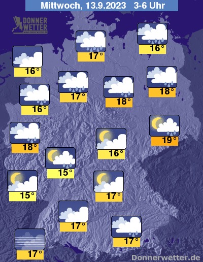 In der Nacht zum Mittwoch zeigt sich der Himmel meist stark oder dicht, vor allem über der Südhälfte auch oft aufgelockert bewölkt, hier blden sich nur vereinzelt, sonst gebietsweise Schauer. Selten können sich auch Gewitter entwickeln. Die Temperatur sinkt auf 19 Grad in Dresden und bis 15 Grad in Saarbrücken.
