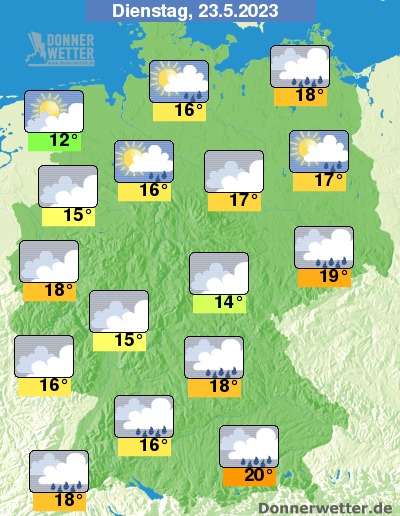 Am Dienstag ist es oft stark, teilweise auch aufgelockert bewölkt. Im Süden und Osten bilden sich gebietsweise Schauer, zudem sind lokale Gewitter möglich, oft bleibt es aber auch trocken. Am Nachmittag heitert der Himmel von Nordwesten immer weiter auf. Die Temperatur steigt auf 12 Grad an der Nordsee und bis 20 Grad in München.