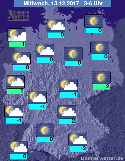 In der bevorstehenden Nacht lockert der Himmel über dem Land verbreitet auf, gebietsweise wird es auch sternenklar, dazu bleibt es trocken. Die Temperatur sinkt auf 1 bis -3 Grad.