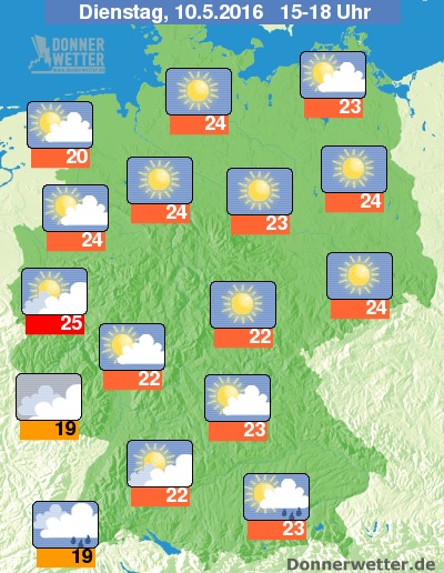 Heute Nachmittag ist es im Süden und Westen des Landes zum Teil aufgelockert, teils jedoch stark bewölkt, am Alpenrand und im Südwesten sind dabei örtliche Schauer, vereinzelt auch Gewitter möglich, sonst bleibt es trocken. Im Norden und Osten ist es überwiegend heiter bis sonnig und es bleibt weitgehend trocken. Die Temperatur steigt auf 19 Grad am Schwarzwald und bis auf sommerliche 25 Grad in der Kölner Bucht.