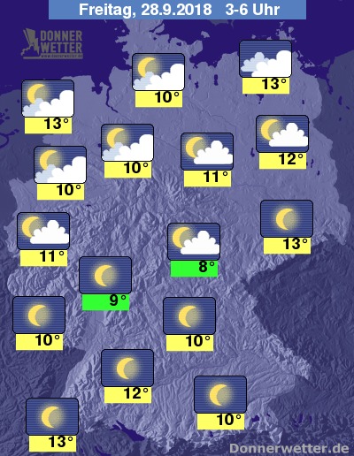 In der Nacht zeigt sich der Himmel zunächst meist sternenklar, an den Küsten bleibt es meist wechselnd oder stark bewölkt. Im weiteren Nachtverlauf nimmt die Bewölkung in der Nordhälfte zu, Schauer sind aber nicht zu erwarten.