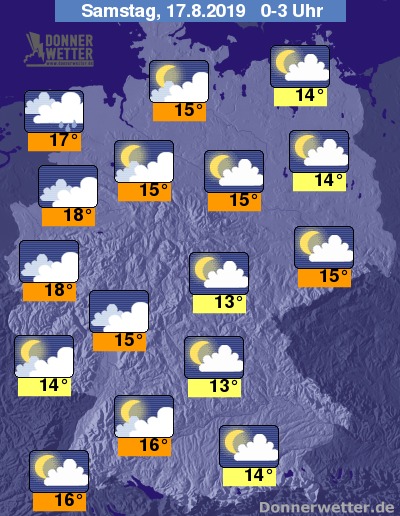 In der Nacht zeigt sich der Himmel über der gesamten Westhälfte meist bedeckt oder aufgelockert bewölkt. In der Osthälfte bestimmen zunächst noch lockere Wolken das Himmelsbild - hier nimmt die Bewölkung im Nachtverlauf dann aber auch verbreitet zu. Lockere Wolken halten sich dann nur noch entlang der Oder. Bis auf einzelne Schauer an der Nordseeküste bleibt es meist trocken.